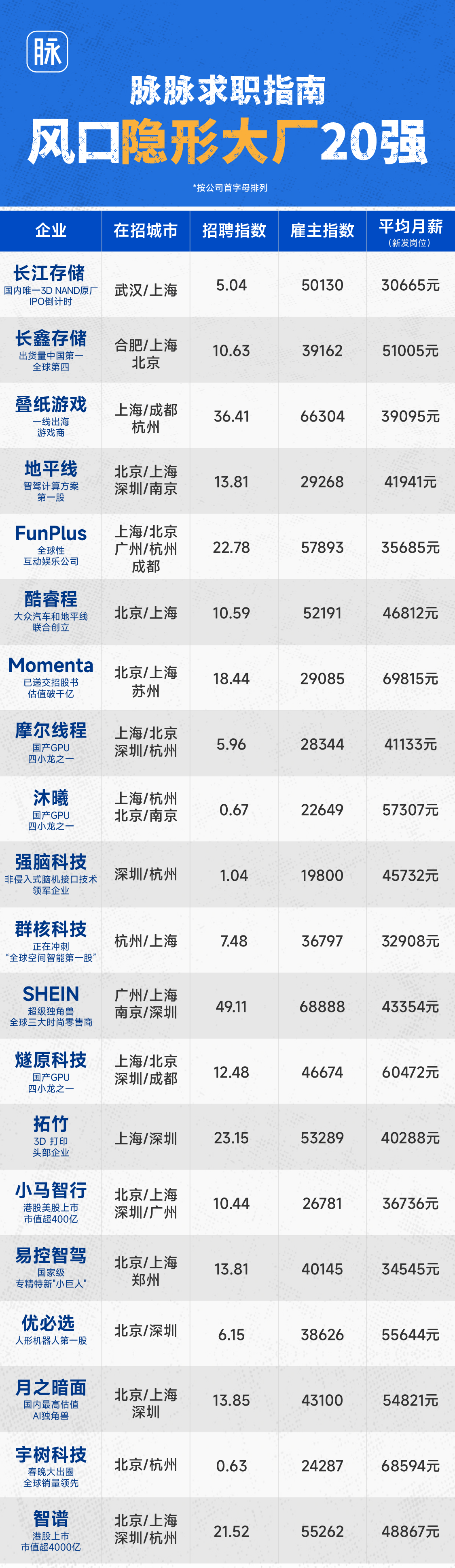 值得注意的是,根据岗位增幅、雇主口碑和新发岗位平均薪资列出的20家高速成长的“隐形大厂20强”中,集中分布于AI、机器人、智能驾驶、芯片等热门风口赛道,既代表着当前科技产业最活跃的方向,也承载着未来更大的增长潜力。
