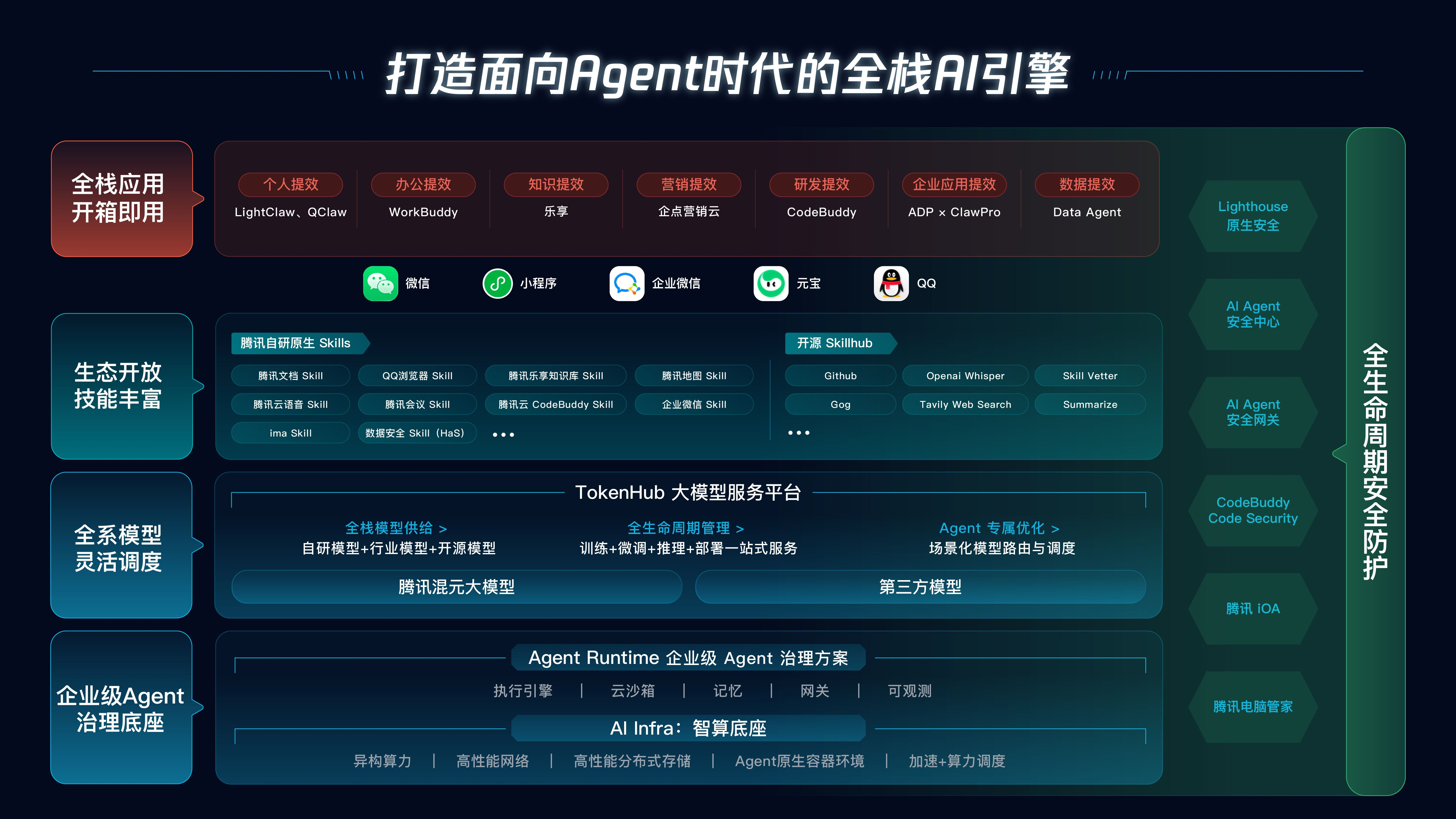 3月27日,在2026腾讯云城市峰会首站上,腾讯云公布2026年AI演进路线:首次发布涵盖基础设施、模型、生态到应用的Agent产品全景图,将MaaS平台升级为TokenHub,推出企业级Agent治理方案,底层平台Cube全面开源,进一步夯实面向AI Agent时代的全栈工程能力。同时,腾讯开放了涵盖自研Skills、开源SkillHub、微信、小程序、企微、元宝、QQ等在内的丰富技能生态,展现出在AI应用场景中的独特优势。